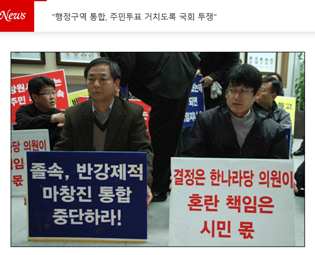 수도권이나 다른 지역에서는 시민의 뜻을 무시하고 강제로 통합을 하였다가는 유권자들이 야당에 표를 몰아줄 확률이 높으므로 그랬다가는 큰일이 날 수 있습니다. 그러나 마산, 창원, 진해라는 도시는 무조건하고 한나라당이기 때문에 강제로 통합하더라도 표가 달아나지 않으리라는 확신이 있었기 때문입니다.