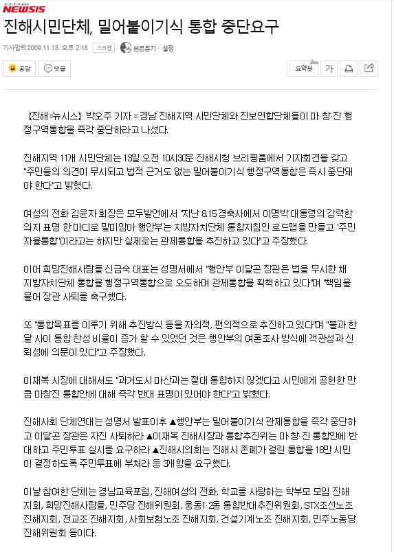 당시 마창진에서도 마산은 워낙 도시가 쇄퇴해가고 황철곤 시장도 통합시가 되어야만 시장선거에 다시 출할 수 있는 기회가 부여되므로 통합에 찬성하는 편이었지만, 창원과 진해시민들은 결단코 반대를 했습니다. 그러자 이명박 정부는 마창진 한 곳이라도 성과를 내고자 온갖 인센티브 제안과 함께 지방 선거를 앞두고 3개 시의 시장과 시의원들에게 공천권을 가지고 무언의 압박을 가했습니다. 그러자 3개 시의 한나라당 시장과 시의원들은 시민들의 뜻은 무시하고 통합에 손을 들고 말았습니다. 말이 자율통합이지 강제통합이었습니다.