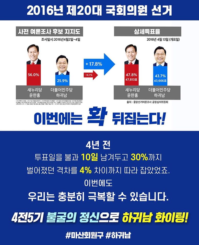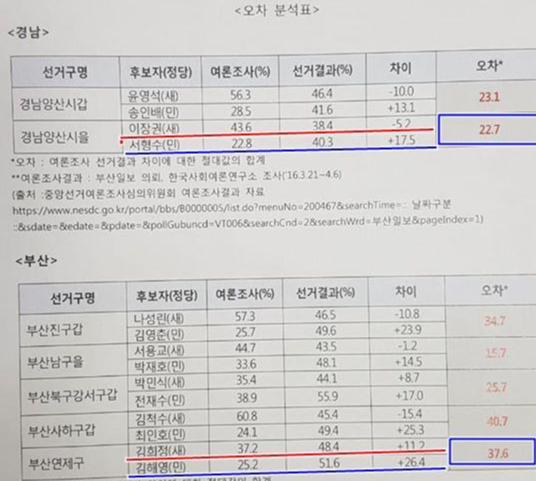 그리고 여론조사를 해보면 직장에 다니는 20~40대의 젊은 층은 여론조사에 응하지를 않고 60대 이후 노년층들만 여론조사에 응하므로 여론조사와 실제 투표결과에는 많은 차이가 있습니다. 지난 20대 총선에서 양산과 부산에서는 완전히 뒤집힌 결과도 있고 마산 회원구의 경우는 30% 차이가 난다고 했는데 4%밖에 차이나지 않았습니다.