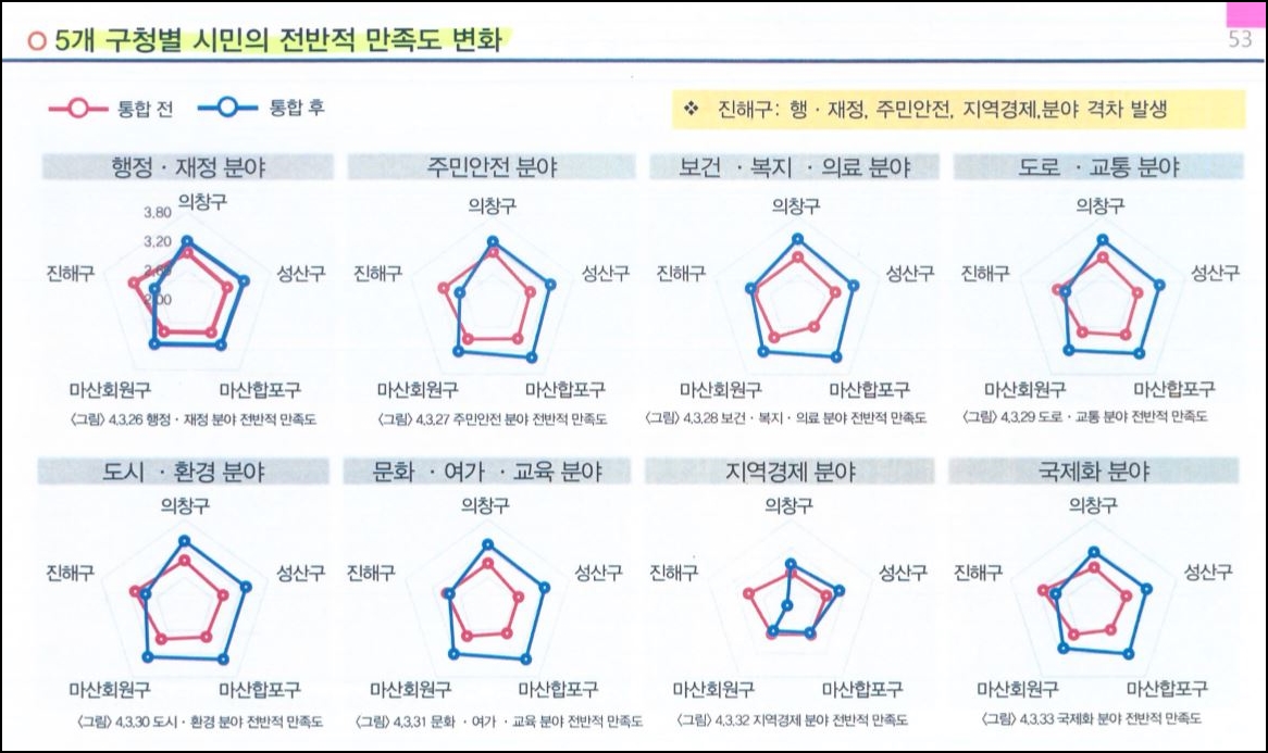 지난해 창원시정연구원이 마창진 통합 10년을 앞두고 조사한 바에 의하면 5개 구청 중 4개 구의 만족도는 통합 후 만족도가 확장되는데 반해, 진해는 행정, 재정, 문화, 경제 모든 분야에서 쪼그라들었습니다.